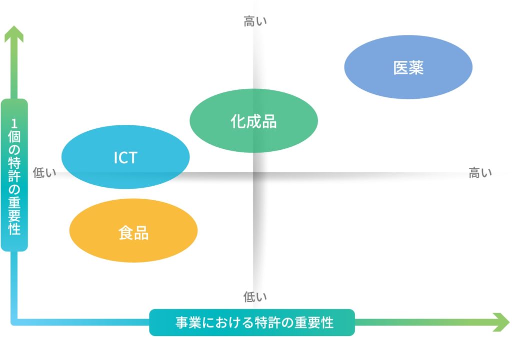 この図は、「特許がその業界でどれくらい重要か」を2軸で整理したものです。