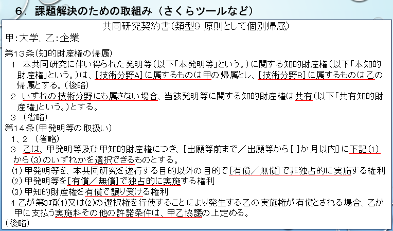 この点は文科省が問題視し、成果の帰属に関する硬直化を打開する目的で、2016年に11類型の契約モデルを作りました。いわゆる“さくらツール”と言う名称の契約モデル集です。ただし、まだ浸透したとは言えない状況です。